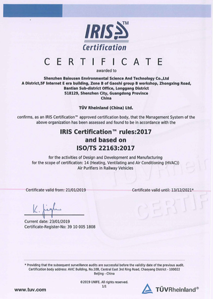 百歐森為“國家高新技術企業”與“國家守合同重信用企業”;國家標準制定者之一;全球唯一獲得“IRIS認證(TS22163)”的空氣凈化企業。深圳知名品牌;被廣東省科學技術廳授予《廣東省空氣智能監測與凈化工程技術研究中心》,具有消毒產品生產企業衛生許可證、環保工程專業承包資質、中國環保產品認證,中國節能產品認證、3C認證、CQC認證等資質,目前擁有國家專利100余項,數百項專利持續申報中。