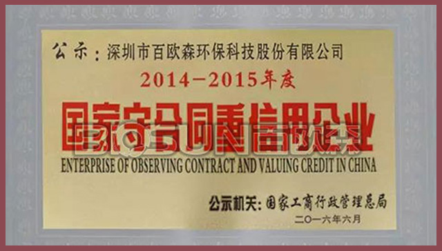 榮譽(yù)是對過去的肯定,而奮斗與發(fā)展才是永恒的主題。百歐森將繼續(xù)突破創(chuàng)新、卓越前行。不忘初心,為環(huán)保事業(yè),奉獻(xiàn)力量,守護(hù)拼搏!“守合同、重信用”已成為企業(yè)在市場競爭中不可或缺的重要品質(zhì)之一,是企業(yè)生存發(fā)展之本、開拓創(chuàng)新之基。