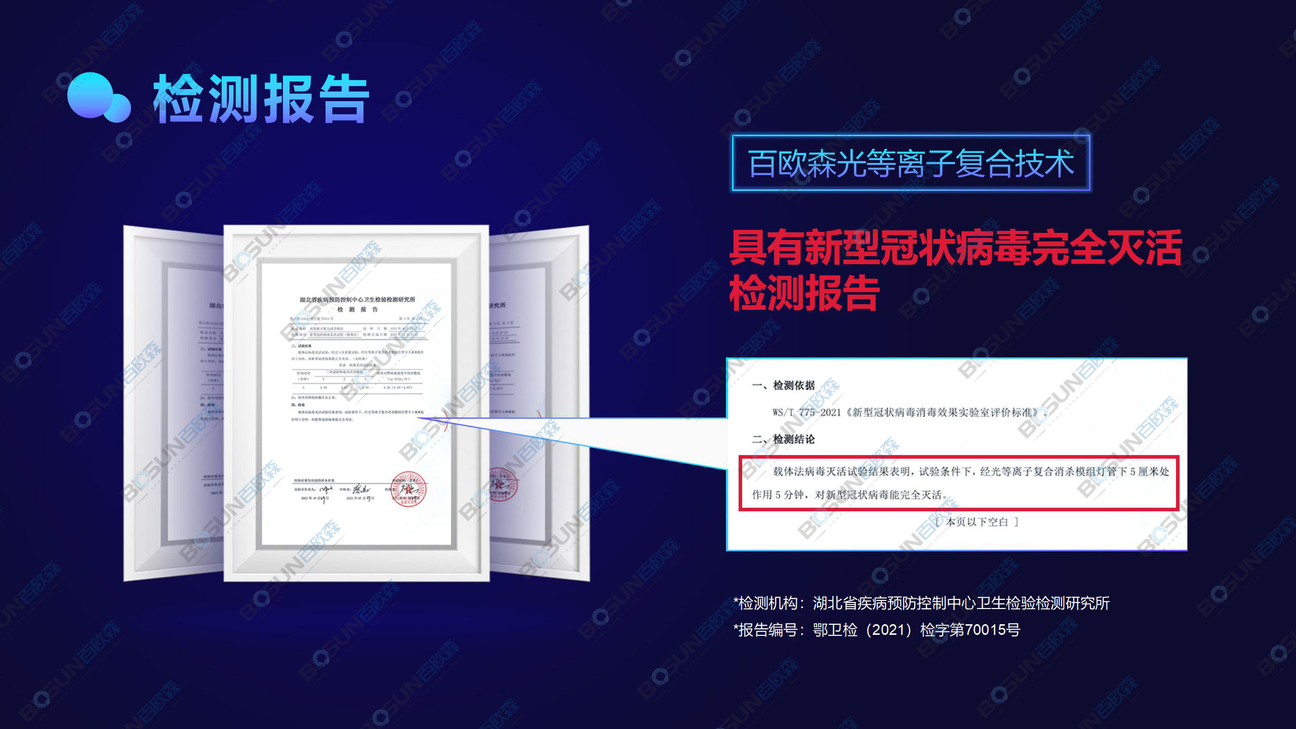 百歐森光等離子技術,在空氣凈化及病毒消殺的細分領域的研究和應用已多年,將細菌、病毒,可揮發有機物TVOC等有害物質分解水分子、氧分子等,技術具有凈化速度快、無殘留、無二次污染,人機共存等優勢特點。以光等離子技術為主導,多項技術的合理結合的技術形式彌補了單項技術所存在的技術缺陷,使的凈化消殺技術達到了前所未有的高度。其對病毒、細菌的殺滅率經“中國疾病預防控制中心”檢測,百歐森光等離子凈化技術對空氣中冠狀病毒、白色葡萄球菌、大腸桿菌等多種病毒和細菌殺滅率高達99.9%。